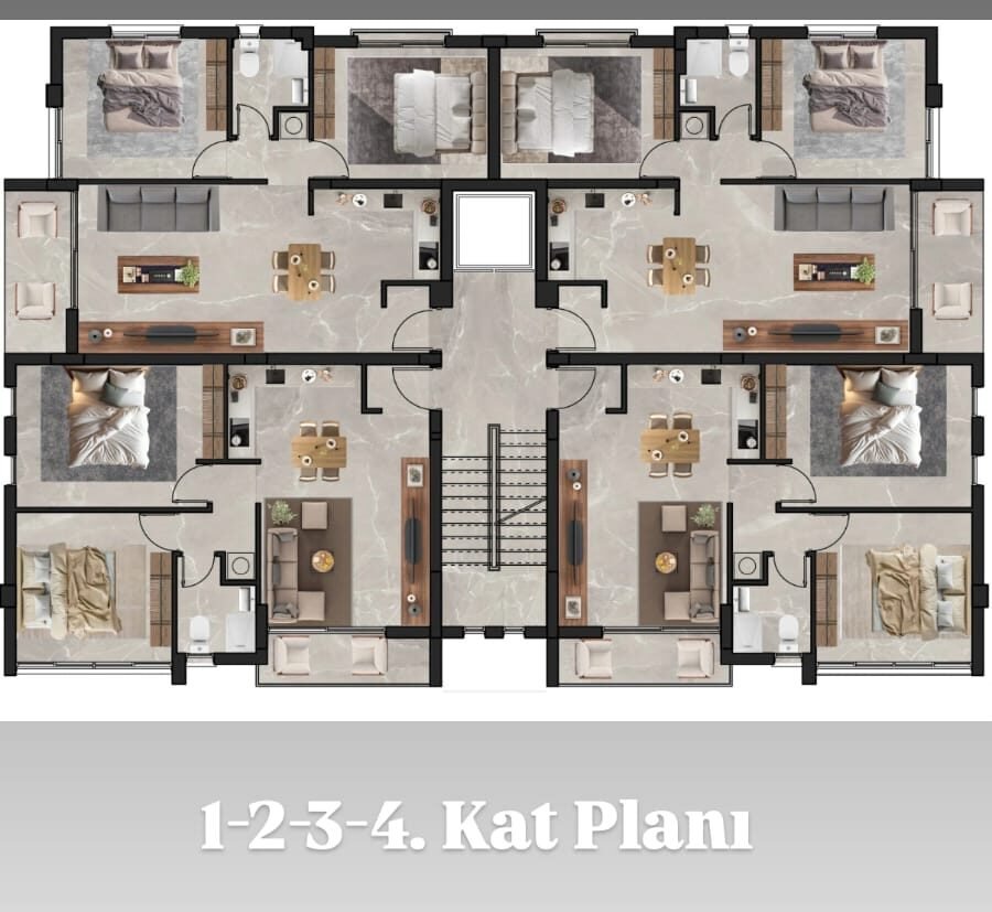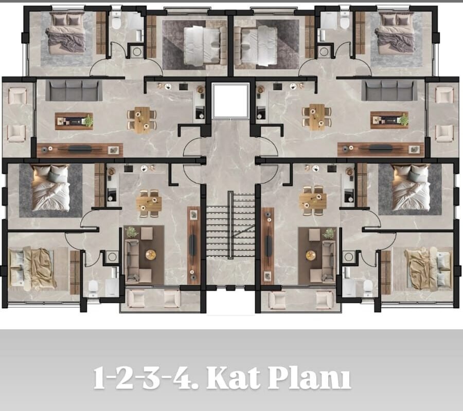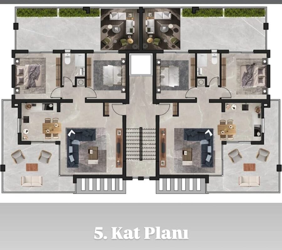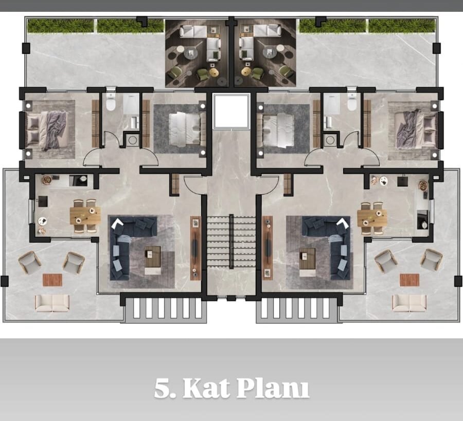3. Tip (penthouse): 5. Katta yer alan özel 2 adet daire, her biri 100 m2 teras alanına sahiptir.